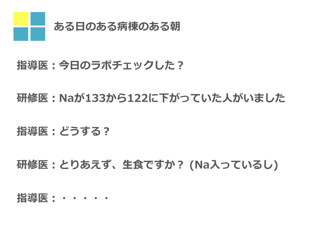 #2. ある日のある病棟のある朝 指導医:今日のラボチェックした? 研修医:Naが133から122に下がっていた人がいました 指導医:どうする? 研修医:とりあえず、生食ですか? (Na入っているし) 指導医:・・・・・