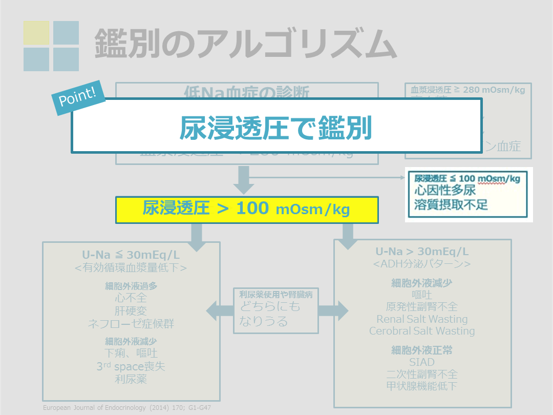 #4. 鑑別のアルゴリズム European Journal of Endocrinology (2014) 170; G1-G47 低Na血症の診断 血漿浸透圧 < 280 mOsm/kg 尿浸透圧 > 100 mOsm/kg