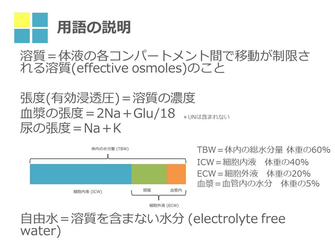 自由水=溶質を含まない水分 (electrolyte free water) *UNは含まれない TBW=体内の総水分量 体重の60% ICW=細胞内液 体重の40% ECW=細胞外液 体重の20%