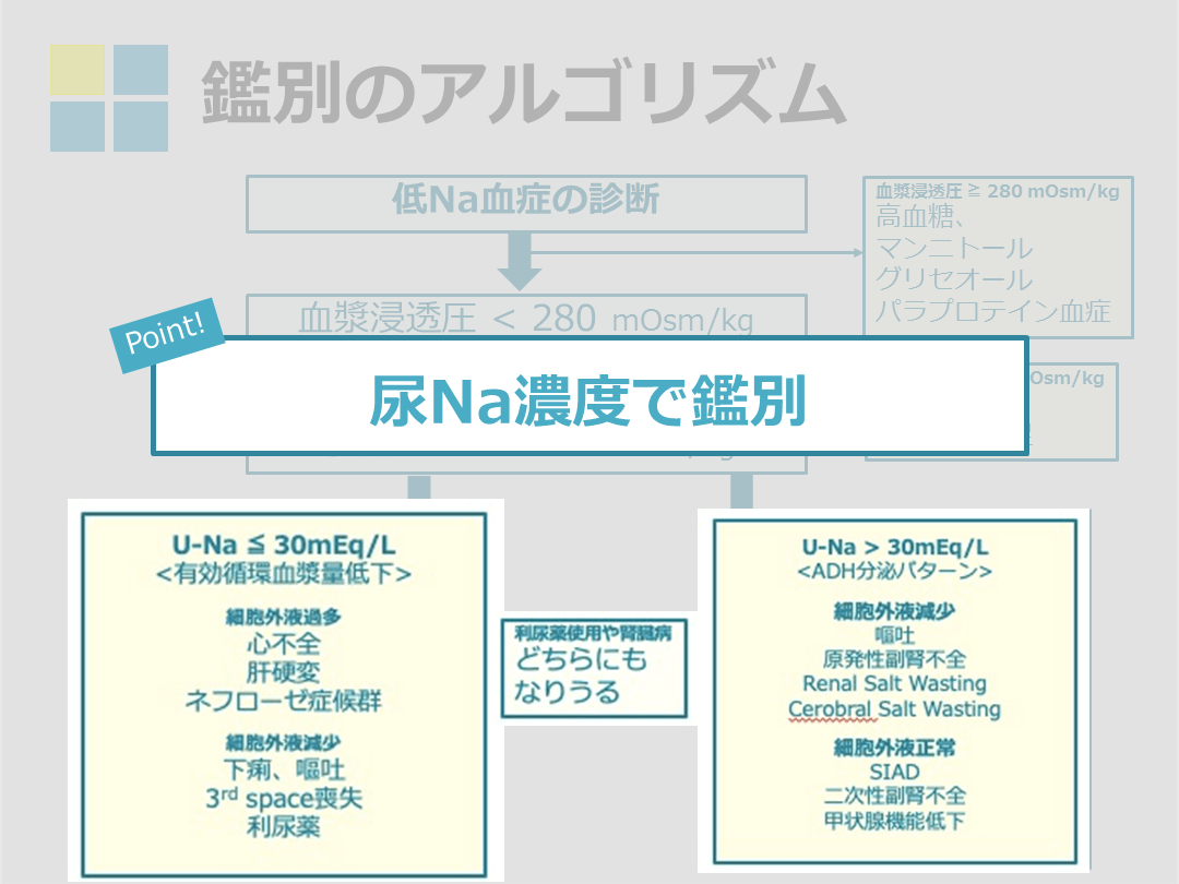 尿浸透圧が上がったり、尿中Na濃度が低下したりするため病歴を確認!