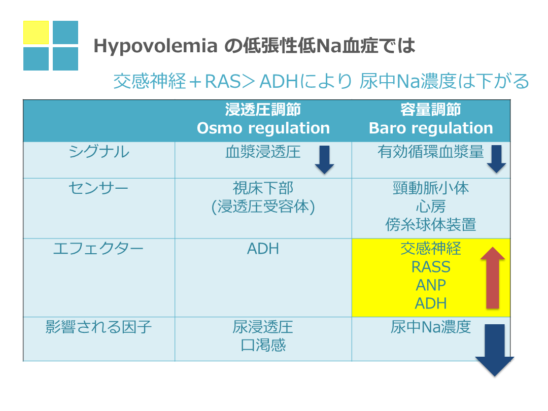 #21. Hypovolemia の低張性低Na血症では 交感神経+RAS>ADHにより 尿中Na濃度は下がる
