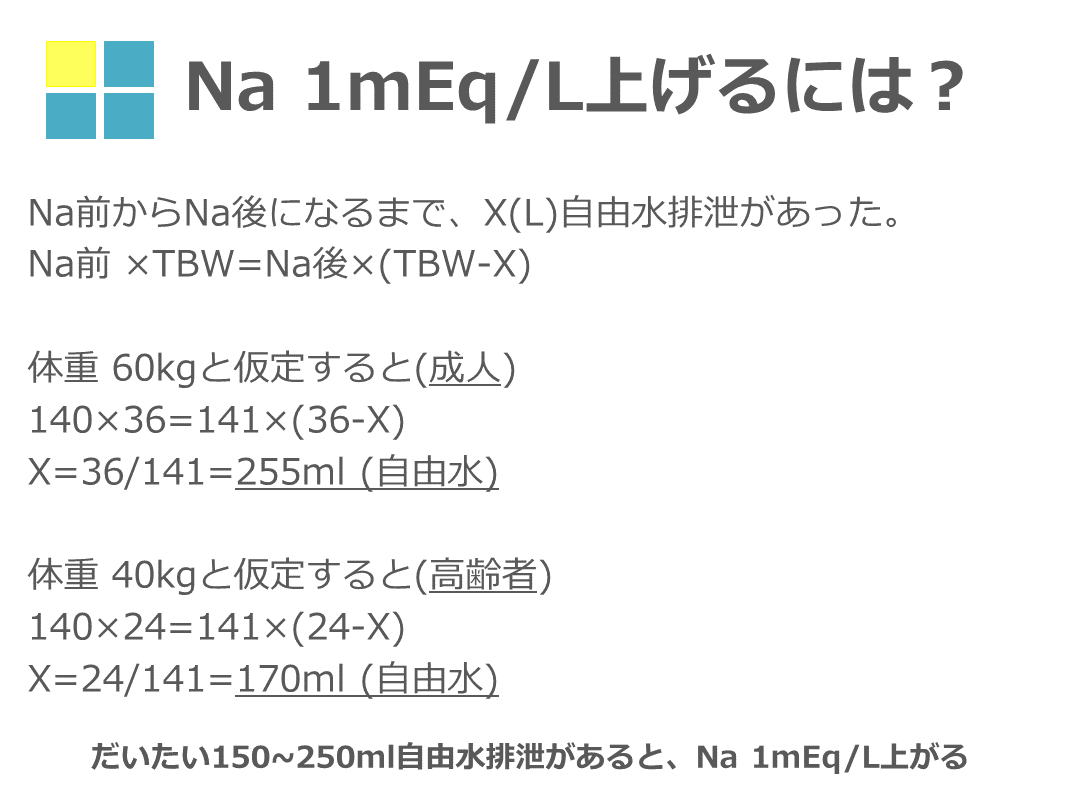 しかしながら、Naは自由水(electrolyte free water)によって濃度が変化する。