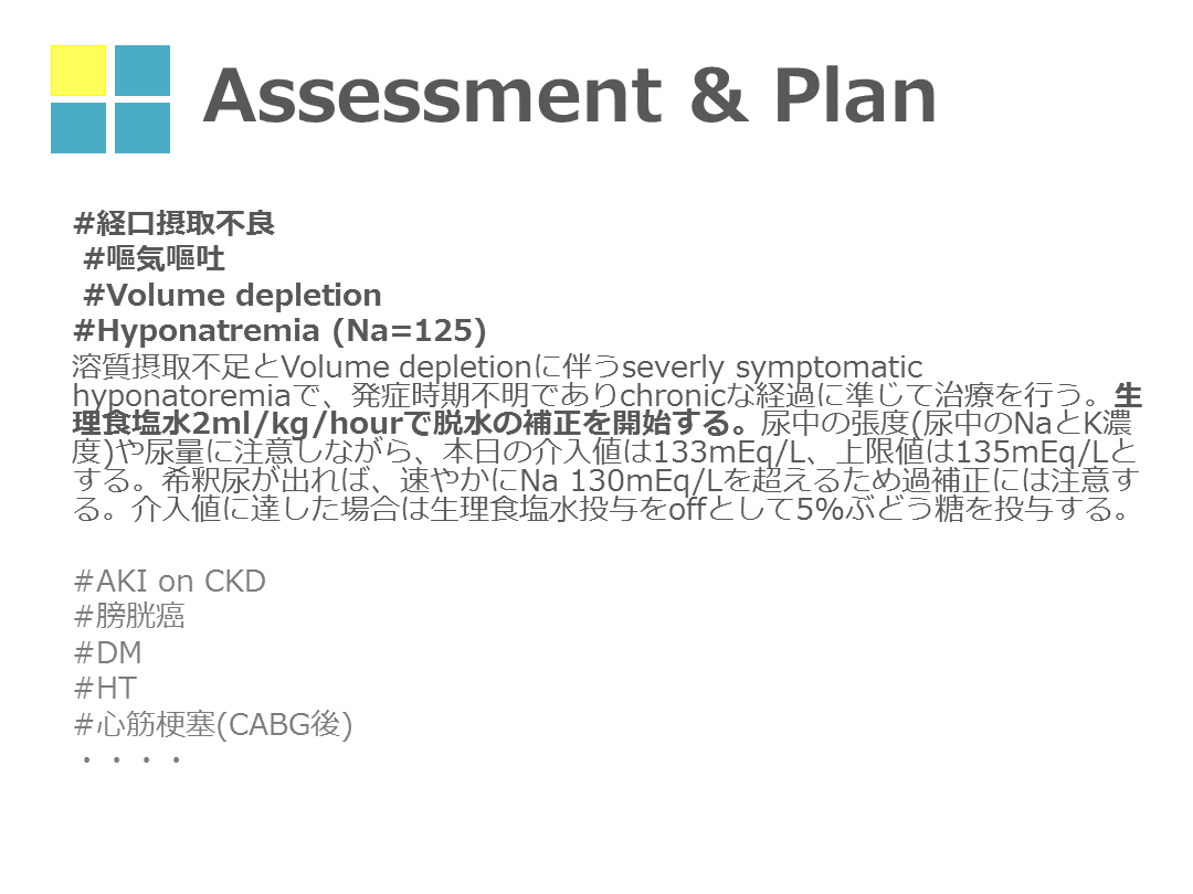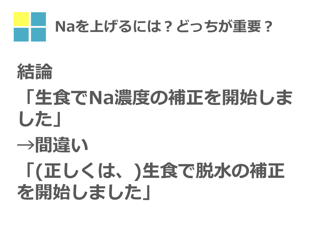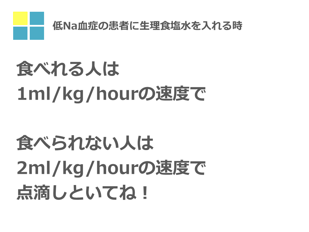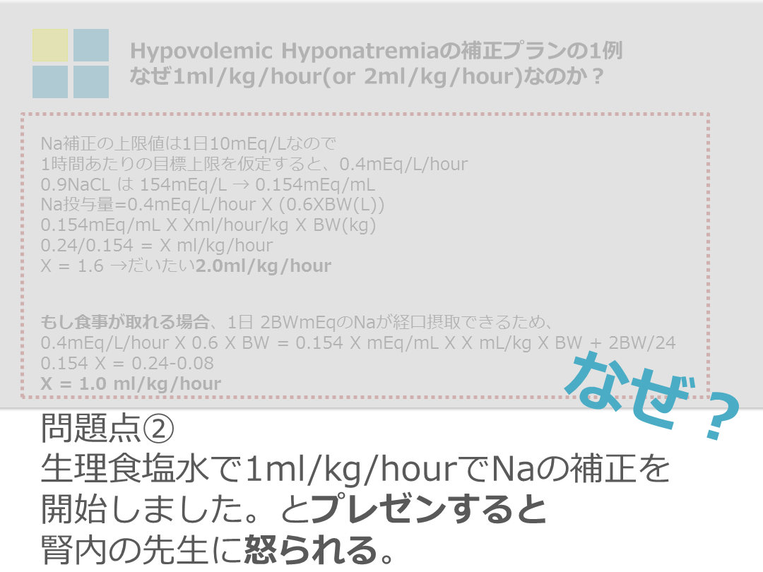 生理食塩水で1ml/kg/hourでNaの補正を開始しました。とプレゼンすると