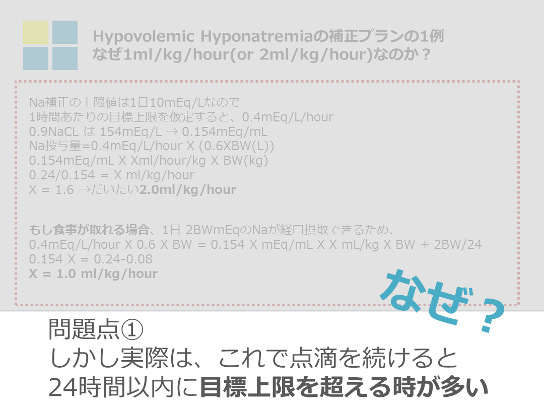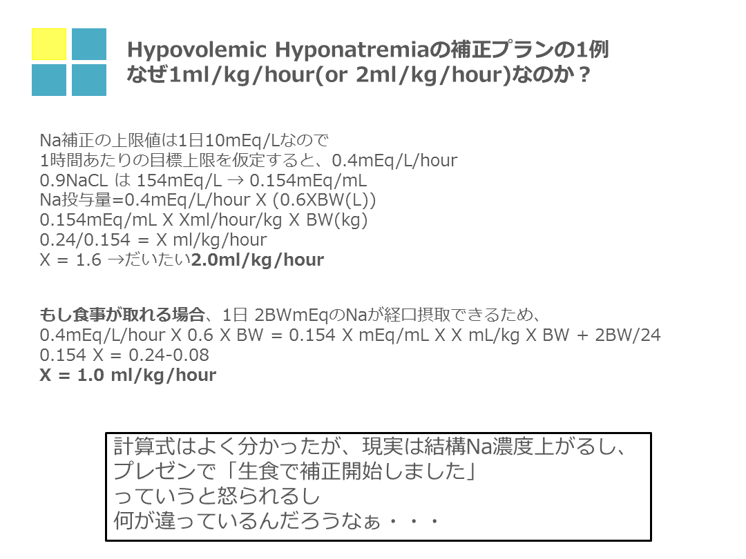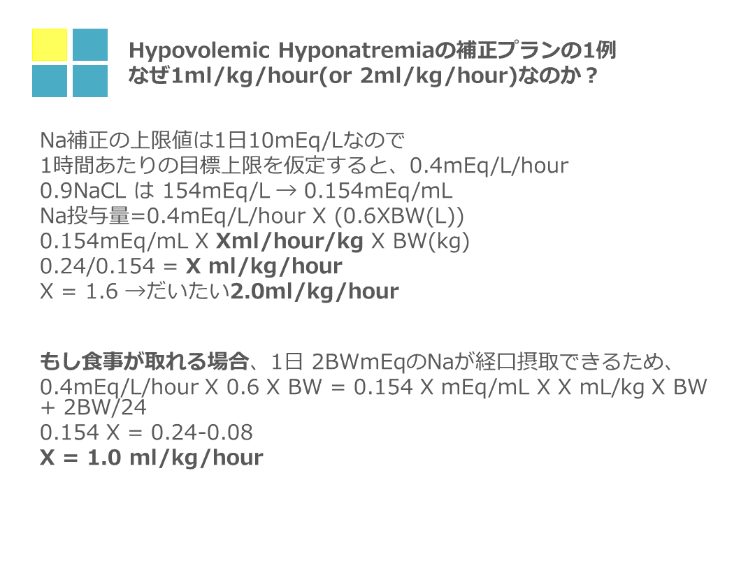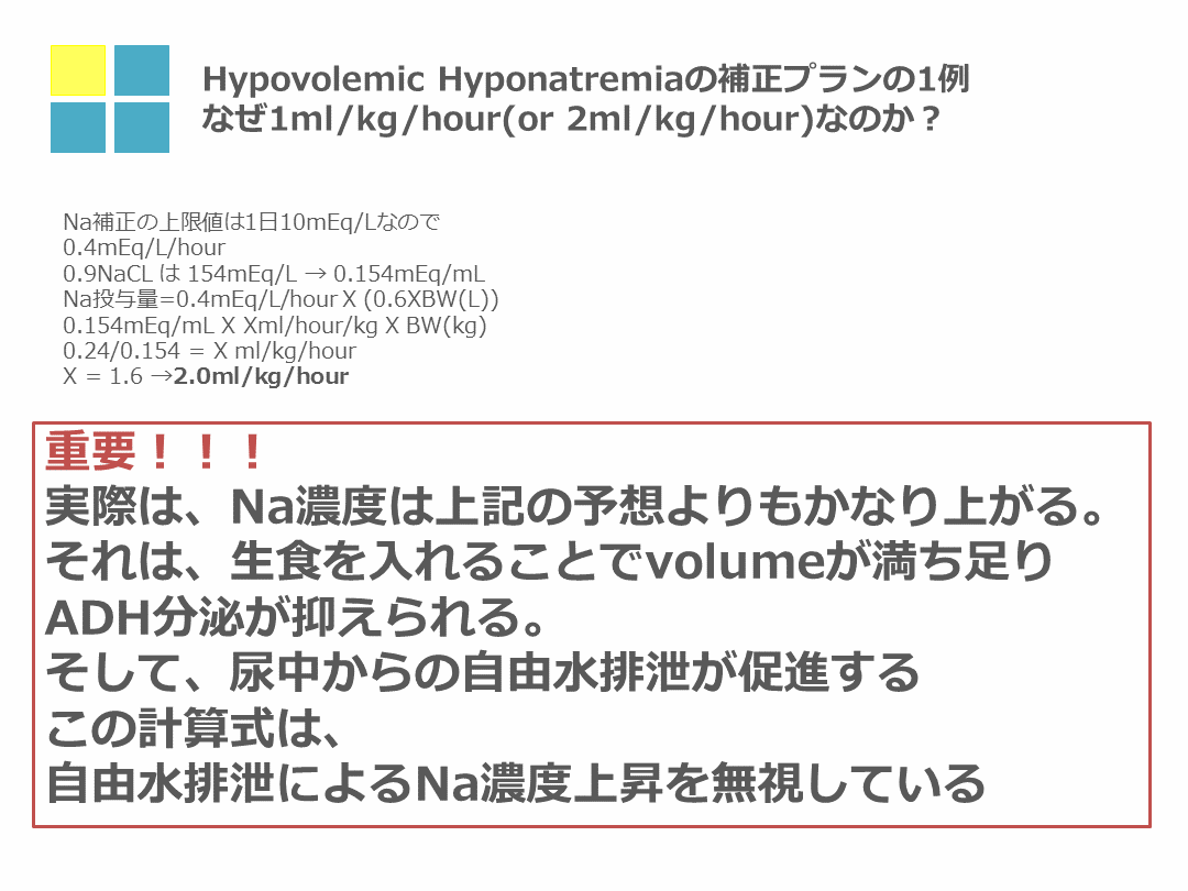 #36. Hypovolemic Hyponatremiaの補正プランの1例なぜ1ml/kg/hour(or 2ml/kg/hour)なのか? Na補正の上限値は1日10mEq/Lなので