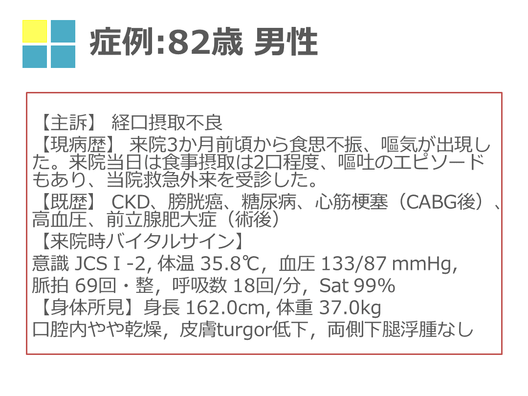 【現病歴】 来院3か月前頃から食思不振、嘔気が出現した。来院当日は食事摂取は2口程度、嘔吐のエピソードもあり、当院救急外来を受診した。
