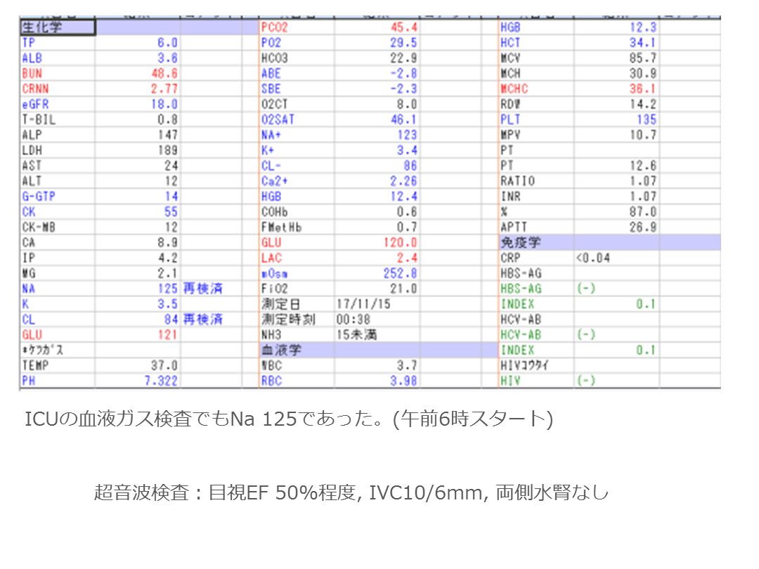 #45. 超音波検査:目視EF 50%程度, IVC10/6mm, 両側水腎なし ICUの血液ガス検査でもNa 125であった。(午前6時スタート)