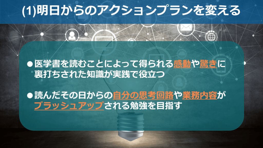 #15. (1)明日からのアクションプランを変える ●医学書を読むことによって得られる感動や驚きに