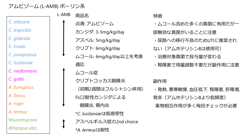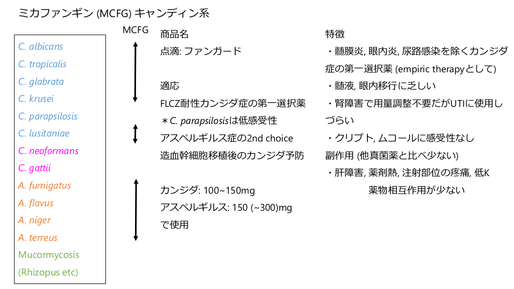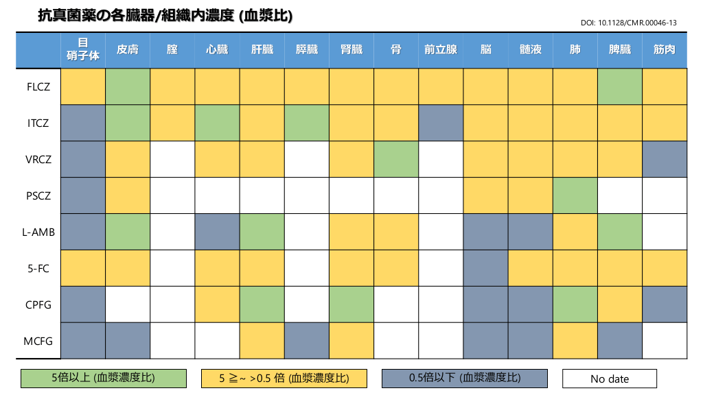 抗真菌薬の各臓器/組織内濃度 (血漿比) 目 硝子体 皮膚 腟 心臓 肝臓 DOI: 10.1128/CMR.00046-13 膵臓 腎臓 骨 前立腺 脳 髄液 肺 脾臓 FLCZ ITCZ VRCZ PSCZ L-AMB 5-FC CPFG MCFG 5倍以上 (血漿濃度比) 5 ≧~ >0.5 倍 (血漿濃度比) 0.5倍以下 (血漿濃度比) No date 筋肉