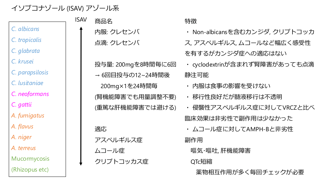 イソブコナゾール (ISAV) アゾール系 ISAV 商品名 特徴 C. albicans 内服: クレセンバ ・ Non-albicansを含むカンジダ, クリプトコッカ C. tropicalis 点滴: クレセンバ ス, アスペルギルス, ムコールなど幅広く感受性 C. glabrata C. krusei C. parapsilosis C. lusitaniae C. neoformans C. gattii を有するがカンジダ症への適応はない 投与量: 200mgを8時間毎に6回 ・ cyclodextrinが含まれず腎障害があっても点滴 → 6回目投与の12~24時間後 静注可能 200mg×1を24時間毎 ・ 内服は食事の影響を受けない (腎機能障害でも用量調整不要) ・ 移行性良好だが髄液移行は不透明 (重篤な肝機能障害では避ける) ・ 侵襲性アスペルギルス症に対してVRCZと比べ A. fumigatus 臨床効果は非劣性で副作用は少なかった A. flavus 適応 ・ ムコール症に対してAMPH-Bと非劣性 A. niger アスペルギルス症 副作用 A. terreus ムコール症 嘔気・嘔吐, 肝機能障害 Mucormycosis クリプトコッカス症 QTc短縮 (Rhizopus etc) 薬物相互作用が多く毎回チェックが必要 カンジダ血症とクリプトコッカス症の治療 #13.