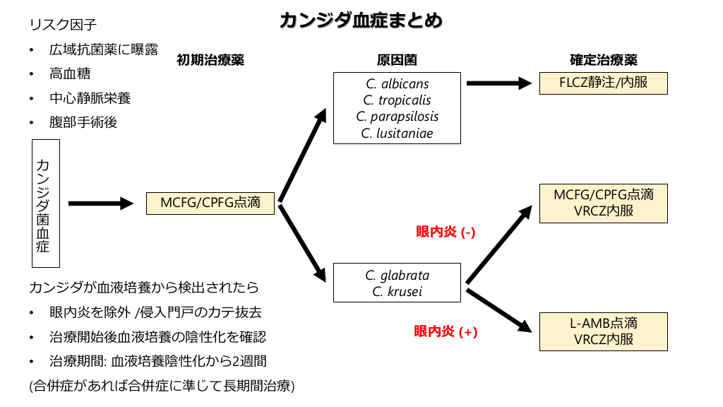 カンジダ血症まとめ リスク因子 • 広域抗菌薬に曝露 • 高血糖 • 中心静脈栄養 • 腹部手術後 カ ン ジ ダ 菌 血 症 初期治療薬 確定治療薬 C. albicans C. tropicalis C. parapsilosis C. lusitaniae FLCZ静注/内服 MCFG/CPFG点滴 VRCZ内服 MCFG/CPFG点滴 眼内炎 (-) カンジダが血液培養から検出されたら • 原因菌 C. glabrata C. krusei 眼内炎を除外 /侵入門戸のカテ抜去 • 治療開始後血液培養の陰性化を確認 • 治療期間: 血液培養陰性化から2週間 (合併症があれば合併症に準じて長期間治療) 眼内炎 (+) L-AMB点滴 VRCZ内服 #14.