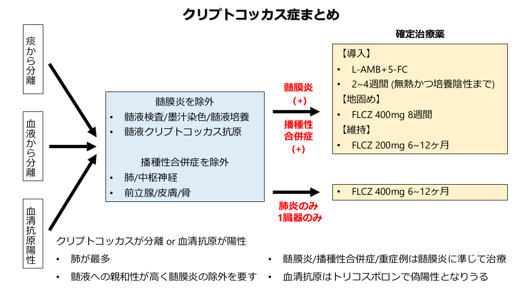 クリプトコッカス症まとめ 確定治療薬 痰 か ら 分 離 【導入】 髄膜炎 (+) 髄膜炎を除外 血 液 か ら 分 離 血 清 抗 原 陽 性 • 髄液検査/墨汁染色/髄液培養 • 髄液クリプトコッカス抗原 播種性 合併症 (+) • L-AMB+5-FC • 2~4週間 (無熱かつ培養陰性まで) 【地固め】 • FLCZ 400mg 8週間 【維持】 • FLCZ 200mg 6~12ヶ月 • FLCZ 400mg 6~12ヶ月 播種性合併症を除外 • 肺/中枢神経 • 前立腺/皮膚/骨 肺炎のみ 1臓器のみ クリプトコッカスが分離 or 血清抗原が陽性 • 肺が最多 • 髄膜炎/播種性合併症/重症例は髄膜炎に準じて治療 • 髄液への親和性が高く髄膜炎の除外を要す • 血清抗原はトリコスポロンで偽陽性となりうる アスペルギルス症のリスク因子と治療 #15.