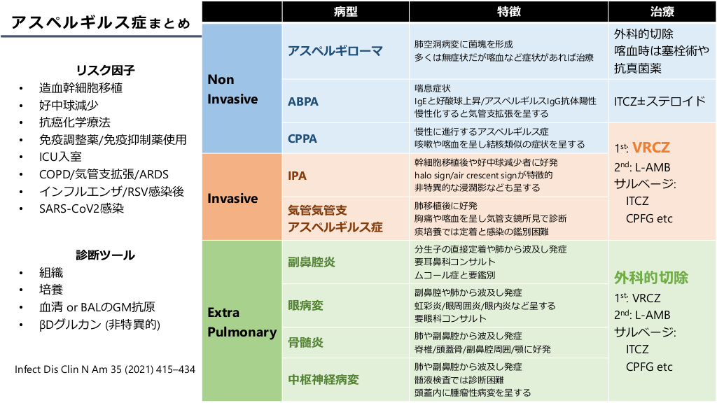 病型 アスペルギルス症まとめ • • • • • • • • リスク因子 造血幹細胞移植 好中球減少 抗癌化学療法 免疫調整薬/免疫抑制薬使用 ICU入室 COPD/気管支拡張/ARDS インフルエンザ/RSV感染後 SARS-CoV2感染 Non Invasive Invasive 診断ツール • • • • 組織 培養 血清 or BALのGM抗原 βDグルカン (非特異的) Infect Dis Clin N Am 35 (2021) 415–434 Extra Pulmonary 特徴 治療 アスペルギローマ 肺空洞病変に菌塊を形成 多くは無症状だが喀血など症状があれば治療 外科的切除 喀血時は塞栓術や 抗真菌薬 ABPA 喘息症状 IgEと好酸球上昇/アスペルギルスIgG抗体陽性 慢性化すると気管支拡張を呈する ITCZ±ステロイド CPPA 慢性に進行するアスペルギルス症 咳嗽や喀血を呈し結核類似の症状を呈する IPA 幹細胞移植後や好中球減少者に好発 halo sign/air crescent signが特徴的 非特異的な浸潤影なども呈する 気管気管支 アスペルギルス症 肺移植後に好発 胸痛や喀血を呈し気管支鏡所見で診断 痰培養では定着と感染の鑑別困難 副鼻腔炎 分生子の直接定着や肺から波及し発症 要耳鼻科コンサルト ムコール症と要鑑別 眼病変 副鼻腔や肺から波及し発症 虹彩炎/眼周囲炎/眼内炎など呈する 要眼科コンサルト 骨髄炎 肺や副鼻腔から波及し発症 脊椎/頭蓋骨/副鼻腔周囲/顎に好発 中枢神経病変 肺や副鼻腔から波及し発症 髄液検査では診断困難 頭蓋内に腫瘤性病変を呈する 1st: VRCZ 2nd: L-AMB サルベージ: ITCZ CPFG etc 外科的切除 1st: VRCZ 2nd: L-AMB サルベージ: ITCZ CPFG etc #16.