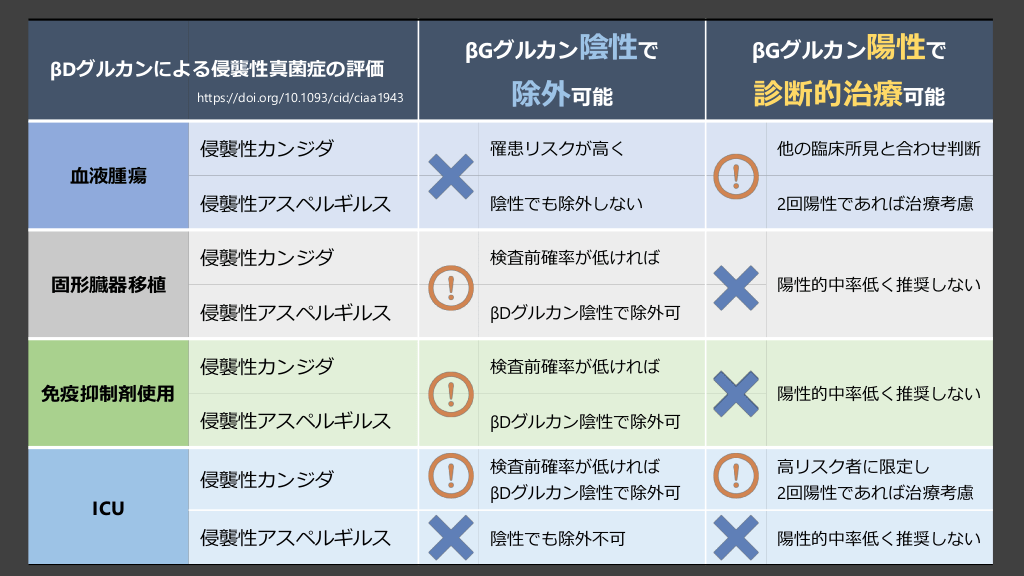 アゾール系 CPA治療薬 ITCZ エキノキャンディン系 VRCZ PSCZ MCFG ポリエン系 CPFG L-AMB 一般名 イトラコナゾール ボリコナゾール ポサコナゾール ミカファンギン カスポファンギン リポソーマル アムホテリシンB 商品名 イトリゾール ブイフェンド ノクサフィル ファンガード カンサイダス アムビゾーム 点滴・内服 点滴・内服 点滴・内服 点滴 点滴 点滴 肝臓 肝臓 肝臓 肝臓 肝臓 肝臓 剤形 代謝経路 CCPA治療 1st 2nd - - - - SAIA治療 - 1st - - - 2nd 他剤使用不可時に 単剤で使用 IA/SAIAの併用薬 副作用が少ない IA/SAIAの 第二選択薬 静菌的作用で 侵襲病態への単剤 使用は非推奨 発熱、腎障害 etc 副作用が多い 特長 副反応/注意点 CCPAの 第一選択薬 IA/SAIAの 第一選択薬 予防投与で使用 他剤使用不可時に 単剤で使用 IA/SAIAの併用薬 副作用が少ない カプセルは空腹時 内服 腎障害時の点滴は 避ける 要TDM 腎障害時の点滴は 避ける 点滴は要CVC 腎障害時の点滴は 避ける 静菌的作用で 侵襲病態への単剤 使用は非推奨 βDグルカンによる侵襲性真菌症の評価 #17. βDグルカンによる侵襲性真菌症の評価 https://doi.org/10.1093/cid/ciaa1943 βGグルカン陰性で βGグルカン陽性で 除外可能 診断的治療可能 侵襲性カンジダ 罹患リスクが高く 他の臨床所見と合わせ判断 侵襲性アスペルギルス 陰性でも除外しない 2回陽性であれば治療考慮 侵襲性カンジダ 検査前確率が低ければ 血液腫瘍 固形臓器移植 陽性的中率低く推奨しない 侵襲性アスペルギルス βDグルカン陰性で除外可 侵襲性カンジダ 検査前確率が低ければ 免疫抑制剤使用 陽性的中率低く推奨しない 侵襲性アスペルギルス 侵襲性カンジダ ICU 侵襲性アスペルギルス βDグルカン陰性で除外可 検査前確率が低ければ 高リスク者に限定し βDグルカン陰性で除外可 2回陽性であれば治療考慮 陰性でも除外不可 陽性的中率低く推奨しない #18.