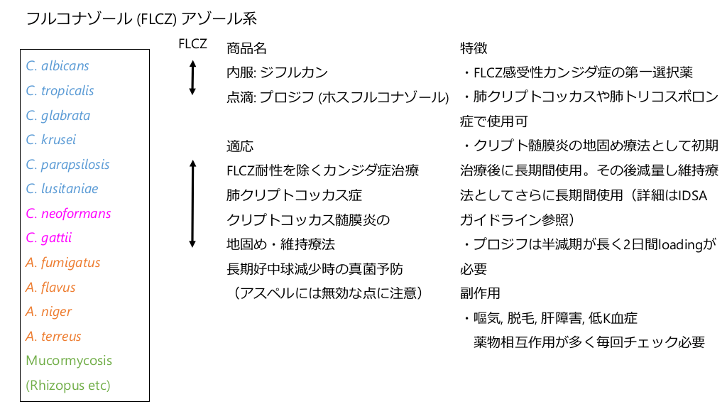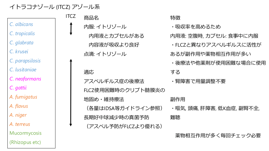 太字: 最頻度の菌 カ ン ジ ダ ク リ プ ト ア ス ペ ル ム コ ー ル FLCZ ITCZ VRCZ MCFG, CPFG L-AMB 赤字は髄液移行あり C. albicans 使用例 C. tropicalis ・アゾール耐性カンジダ C. glabrata →MCFG or CPFG C. krusei ・アゾール感受性カンジダ C. parapsilosis →FLCZ C. lusitaniae ・アスペルギルス C. neoformans →VRCZ C. gattii ・クリプト髄膜炎 A. fumigatus →L-AMB (+アンコチル) A. flavus ・肺クリプト症 A. niger →FLCZ A. terreus ・ムコール症 Mucormycosis →L-AMB (Rhizopus etc) #4. 抗真菌薬まとめ FLCZ ITCZ VRCZ PSCZ ISAV C. auris C. albicans stepdown MCFG・CPFG L-AMB 1st 2nd 1st 2nd C. glabrata stepdown 1st 2nd C. krusei stepdown 1st 2nd 2nd C. parapsilosis stepdown 1st C. lusitaniae stepdown 1st C. neoformans stepdown T. asahii 1st A. fumigatus 1st 1st 1st A. terreus 1st 1st 1st 2nd 2nd Mucormycosis Scedosporium Fusarium 感受性あり 1st 2nd stepdown 2nd 感受性結果次第 備考 再発例: キャンディン+L-AMB FLCZ: 高用量で使用可な 場合もあるが他剤優先 1st 髄膜炎: 初期5FC併用 2nd 再発例: VRCZ+L-AMB 2nd 1st 再発例: VRCZ+キャンディン PSCZとISAVは 髄液移行性に乏しい 1st 感受性なし https://doi.org/10.1177/20499361231224980 フルコナゾールとイトラコナゾールの特徴 #5.