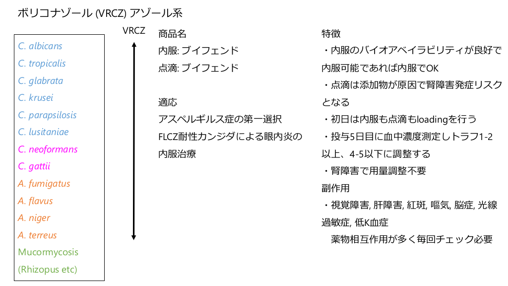 ボリコナゾール (VRCZ) アゾール系 VRCZ 商品名 特徴 C. albicans 内服: ブイフェンド ・内服のバイオアベイラビリティが良好で C. tropicalis 点滴: ブイフェンド 内服可能であれば内服でOK C. glabrata ・点滴は添加物が原因で腎障害発症リスク C. krusei 適応 となる C. parapsilosis アスペルギルス症の第一選択 ・初日は内服も点滴もloadingを行う FLCZ耐性カンジダによる眼内炎の ・投与5日目に血中濃度測定しトラフ1-2 内服治療 以上、4-5以下に調整する C. lusitaniae C. neoformans C. gattii ・腎障害で用量調整不要 A. fumigatus 副作用 A. flavus ・視覚障害, 肝障害, 紅斑, 嘔気, 脳症, 光線 A. niger 過敏症, 低K血症 A. terreus Mucormycosis (Rhizopus etc) 薬物相互作用が多く毎回チェック必要 #8.