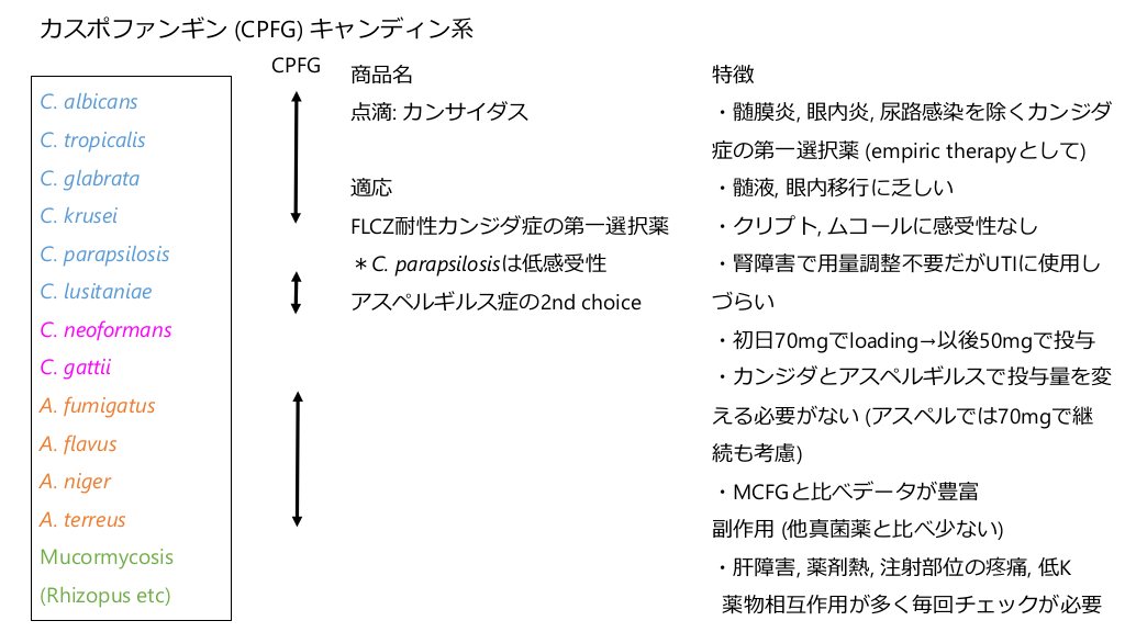 カスポファンギン (CPFG) キャンディン系 CPFG C. albicans 商品名 特徴 点滴: カンサイダス ・髄膜炎, 眼内炎, 尿路感染を除くカンジダ C. tropicalis C. glabrata C. krusei C. parapsilosis C. lusitaniae 症の第一選択薬 (empiric therapyとして) 適応 ・髄液, 眼内移行に乏しい FLCZ耐性カンジダ症の第一選択薬 ・クリプト, ムコールに感受性なし *C. parapsilosisは低感受性 ・腎障害で用量調整不要だがUTIに使用し アスペルギルス症の2nd choice づらい C. neoformans ・初日70mgでloading→以後50mgで投与 C. gattii ・カンジダとアスペルギルスで投与量を変 A. fumigatus える必要がない (アスペルでは70mgで継 A. flavus 続も考慮) A. niger ・MCFGと比べデータが豊富 A. terreus Mucormycosis (Rhizopus etc) 副作用 (他真菌薬と比べ少ない) ・肝障害, 薬剤熱, 注射部位の疼痛, 低K 薬物相互作用が多く毎回チェックが必要 #10.