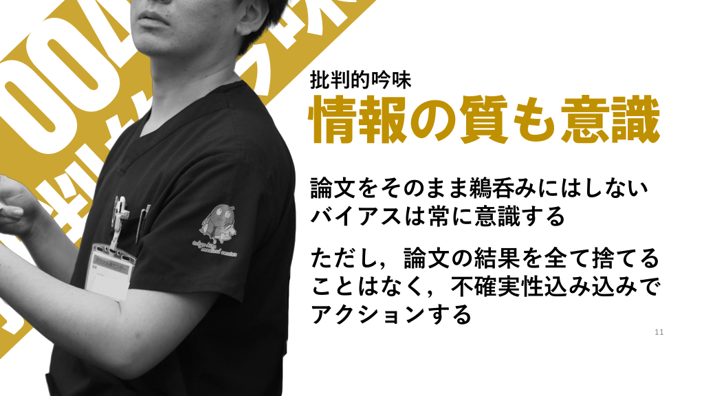 #11. 批判的吟味 情報の質も意識 論文をそのまま鵜呑みにはしない バイアスは常に意識する ただし,論文の結果を全て捨てる ことはなく,不確実性込み込みで アクションする 11