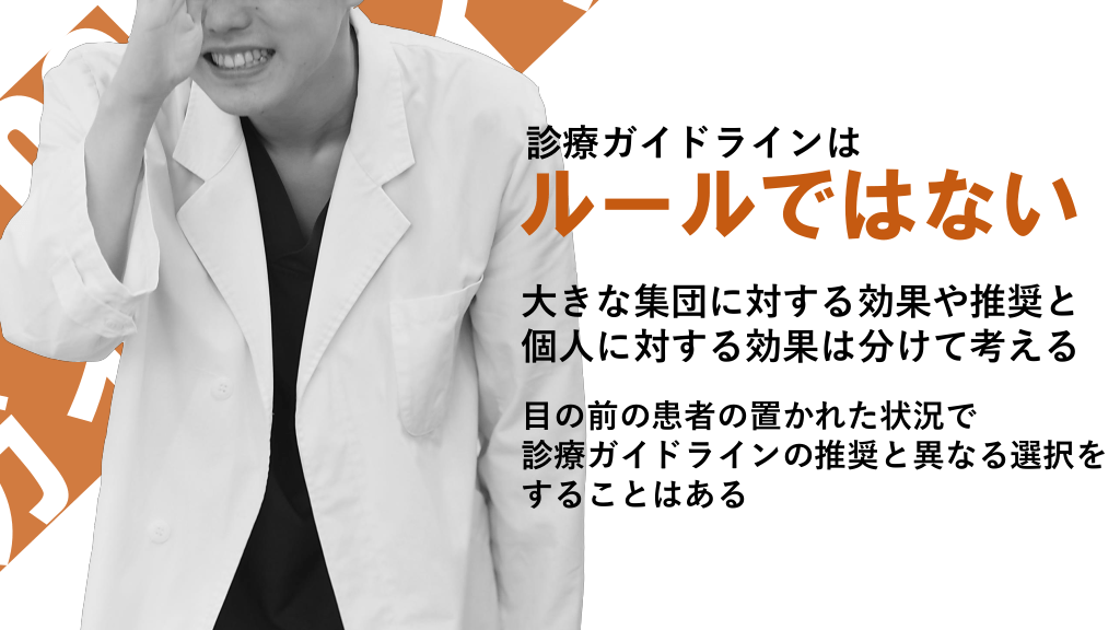 #13. 診療ガイドラインは ルールではない 大きな集団に対する効果や推奨と 個人に対する効果は分けて考える 目の前の患者の置かれた状況で 診療ガイドラインの推奨と異なる選択を することはある