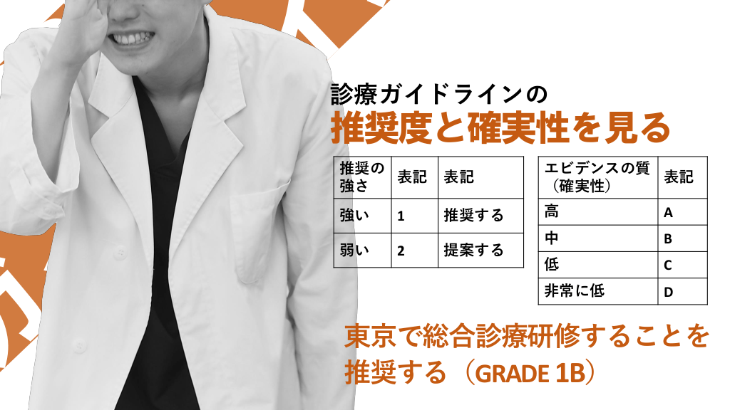 #14. 診療ガイドラインの 推奨度と確実性を見る 推奨の 表記 強さ 表記 エビデンスの質 表記 (確実性) 強い 推奨する 高 A 中 B 低 C 非常に低 D 弱い 1 2 提案する 東京で総合診療研修することを 推奨する(GRADE 1B)