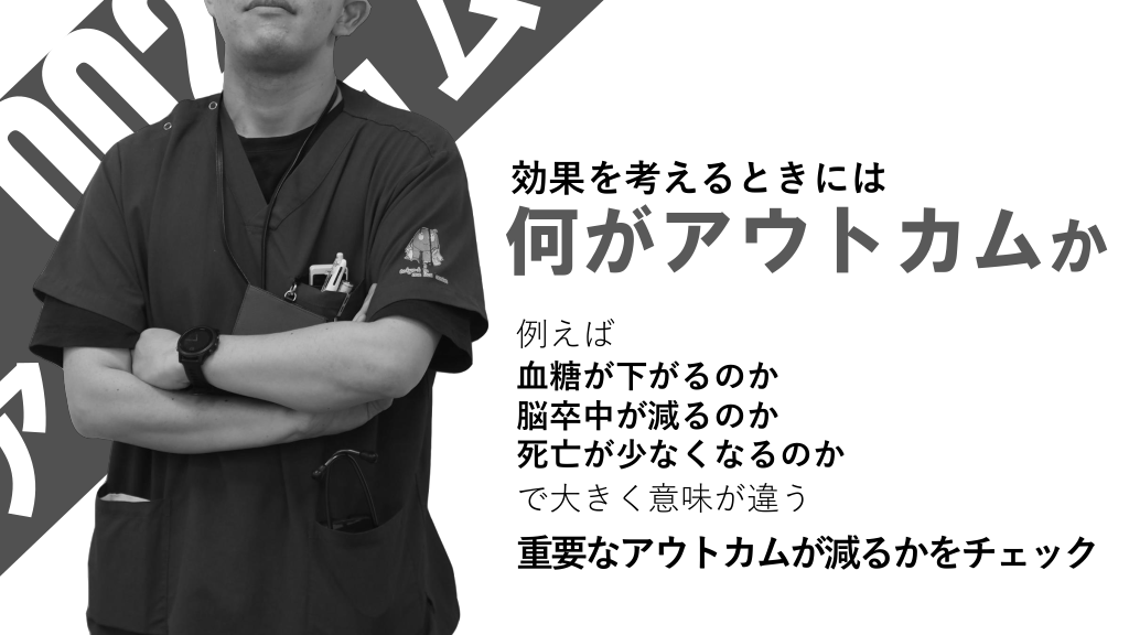 #6. 効果を考えるときには 何がアウトカムか 例えば 血糖が下がるのか 脳卒中が減るのか 死亡が少なくなるのか で大きく意味が違う 重要なアウトカムが減るかをチェック