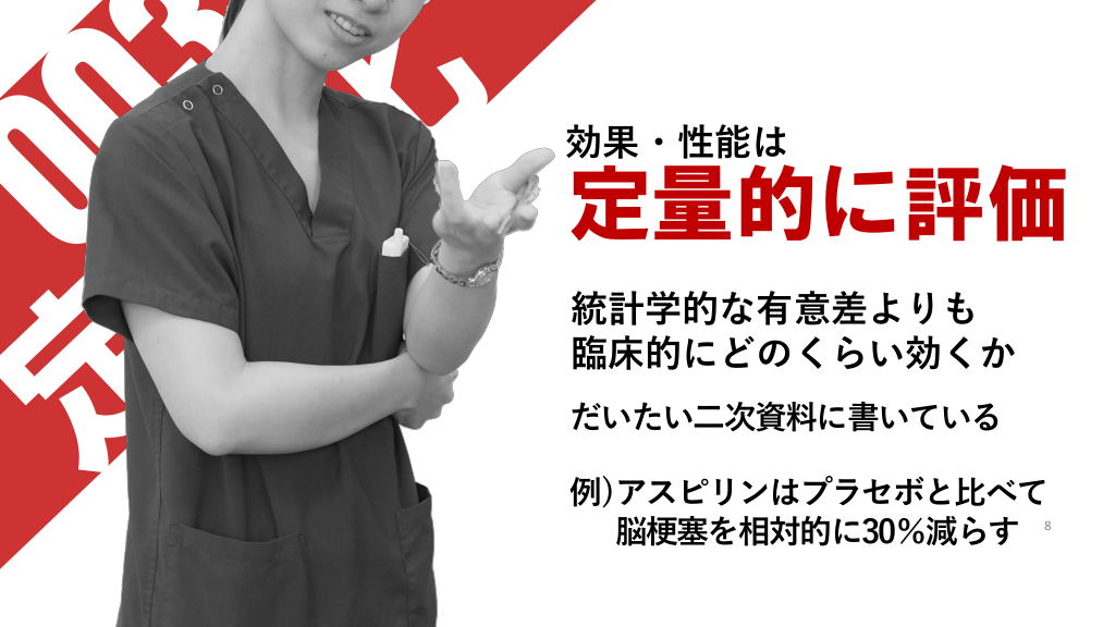 #8. 効果・性能は 定量的に評価 統計学的な有意差よりも 臨床的にどのくらい効くか だいたい二次資料に書いている 例)アスピリンはプラセボと比べて 脳梗塞を相対的に30%減らす 8