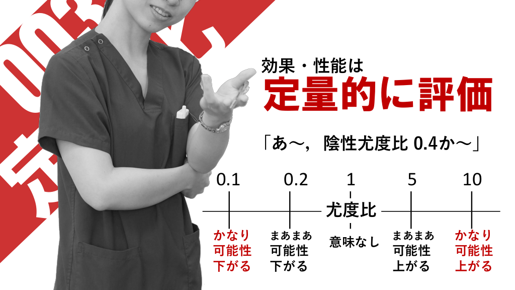 #9. 効果・性能は 定量的に評価 「あ~,陰性尤度比 0.4か~」 0.1 0.2 1 5 10 まあまあ かなり 可能性 上がる 尤度比 かなり 可能性 下がる まあまあ 可能性 下がる 意味なし 可能性 上がる