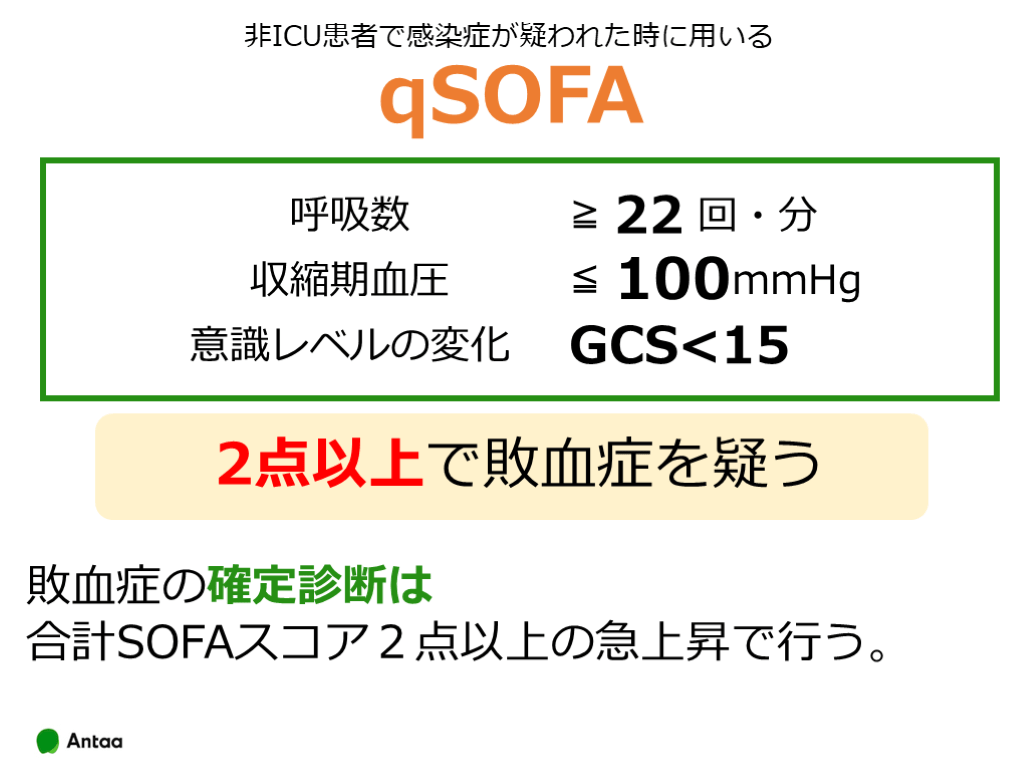 #3. qSOFA 非ICU患者で感染症が疑われた時に用いる 2点以上で敗血症を疑う 敗血症の確定診断は
