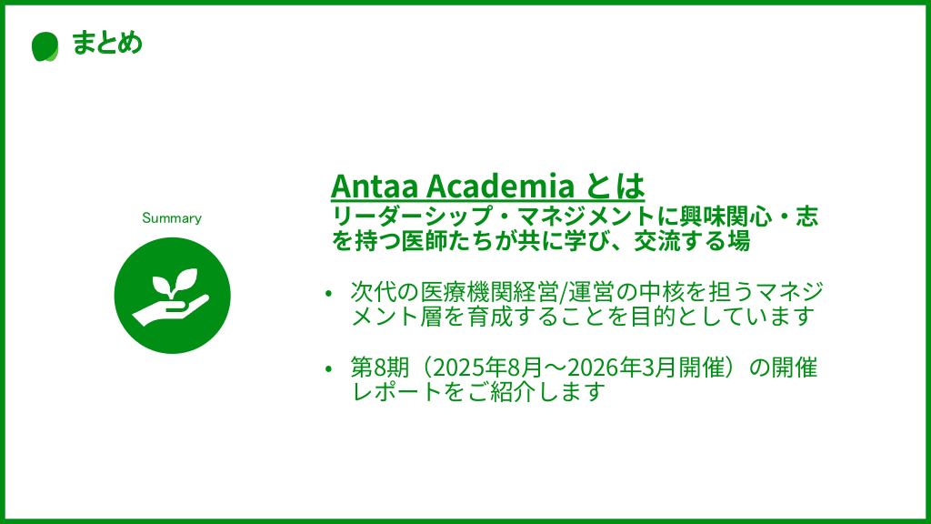 #2. まとめ Antaa Academia とは Summary リーダーシップ‧マネジメントに興味関⼼‧志 を持つ医師たちが共に学び、交流する場 • 次代の医療機関経営/運営の中核を担うマネジ メント層を育成することを⽬的としています • 第8期(2025年8⽉〜2026年3⽉開催)の開催 レポートをご紹介します