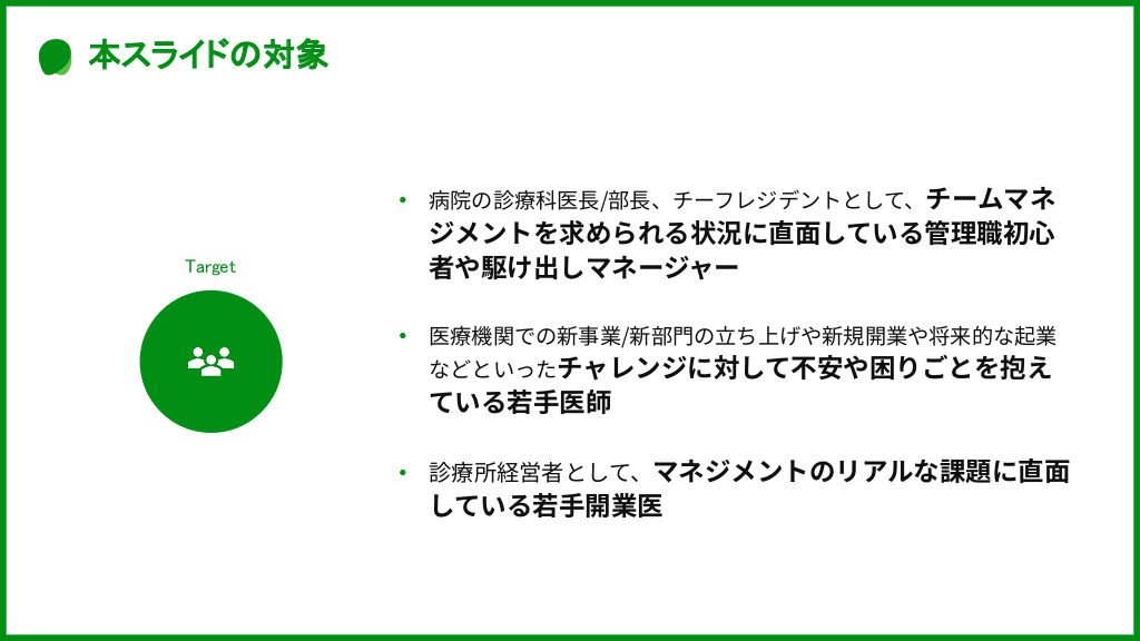 #3. 本スライドの対象 • 病院の診療科医⻑/部⻑、チーフレジデントとして、チームマネ Target ジメントを求められる状況に直⾯している管理職初⼼ 者や駆け出しマネージャー • 医療機関での新事業/新部⾨の⽴ち上げや新規開業や将来的な起業 などといったチャレンジに対して不安や困りごとを抱え ている若⼿医師 • 診療所経営者として、マネジメントのリアルな課題に直⾯ している若⼿開業医