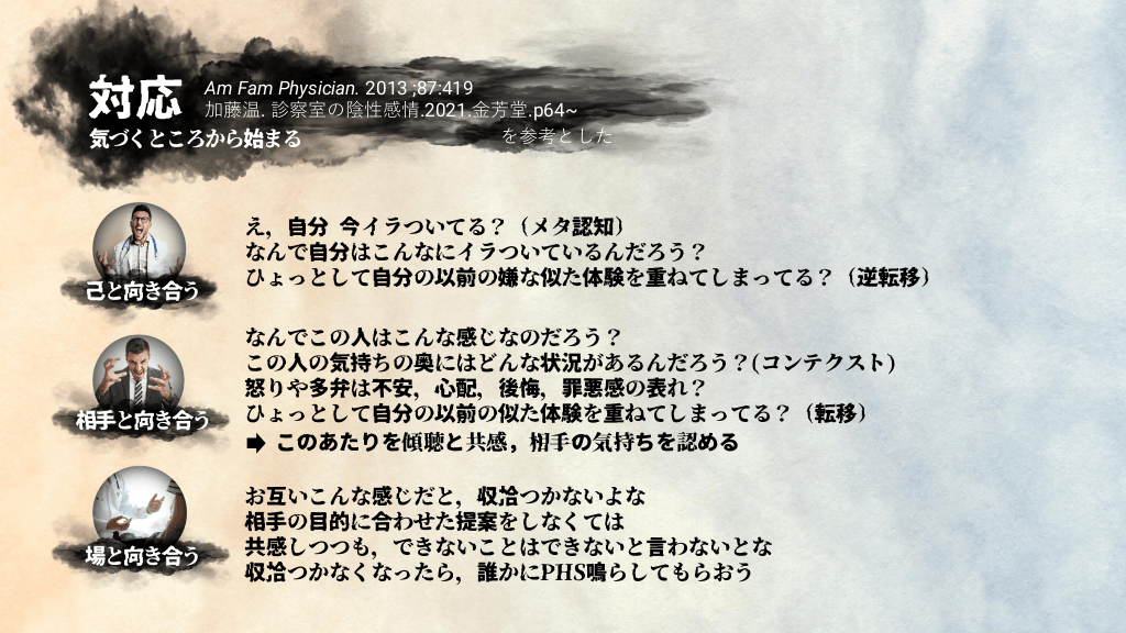 #15. Am Fam Physician. 2013 ;87:419 加藤温. 診察室の陰性感情.2021.金芳堂.p64~ を参考とした