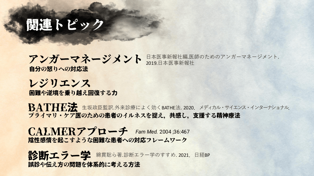 #17. 日本医事新報社編.医師のためのアンガーマネージメント. 2019.日本医事新報社 生坂政臣監訳.外来診療によく効くBATHE法. 2020.メディカル・サイエンス・インターナショナル. Fam Med. 2004 ;36:467 綿貫聡ら著.診断エラー学のすすめ. 2021.日経BP