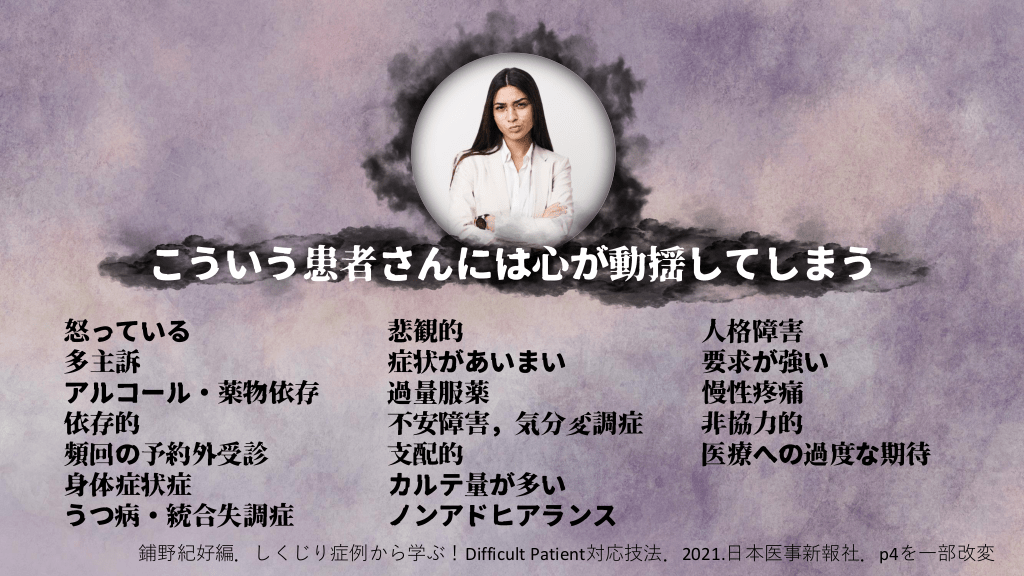 #10. 鋪野紀好編.しくじり症例から学ぶ!Difficult Patient対応技法.2021.日本医事新報社.p4を一部改変
