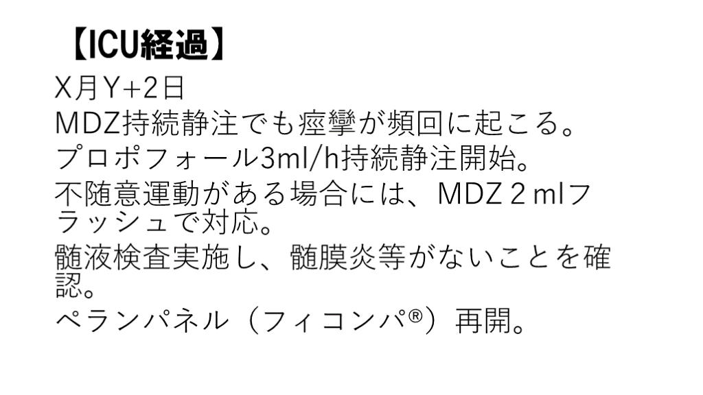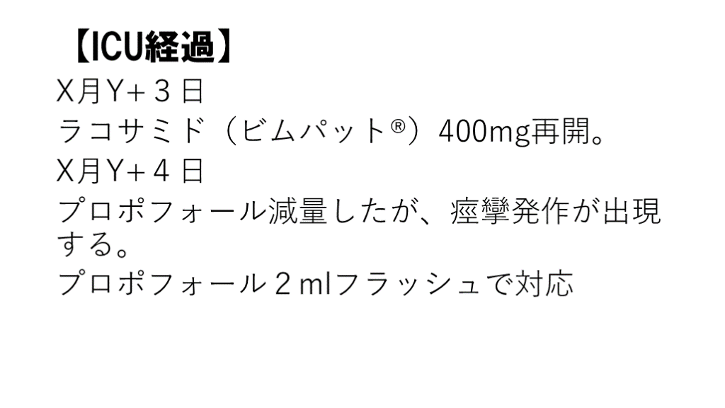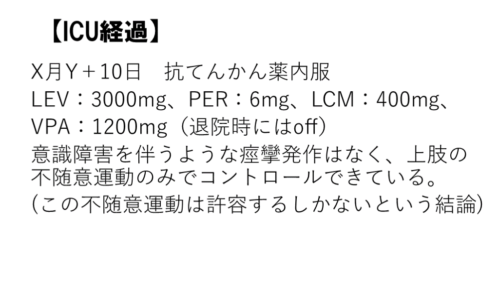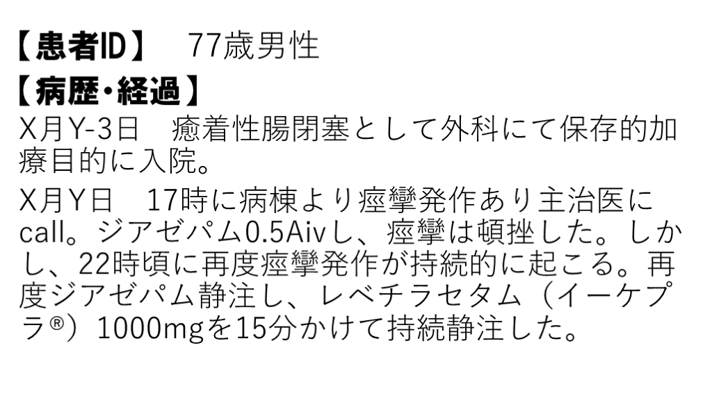 X月Y日 17時に病棟より痙攣発作あり主治医にcall。ジアゼパム0.5Aivし、痙攣は頓挫した。しかし、22時頃に再度痙攣発作が持続的に起こる。再度ジアゼパム静注し、レベチラセタム(イーケプラ®︎)1000mgを15分かけて持続静注した。