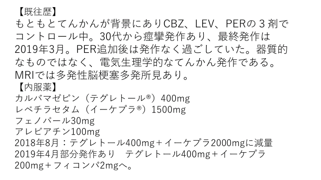 もともとてんかんが背景にありCBZ、LEV、PERの3剤でコントロール中。30代から痙攣発作あり、最終発作は2019年3月。PER追加後は発作なく過ごしていた。器質的なものではなく、電気生理学的なてんかん発作である。MRIでは多発性脳梗塞多発所見あり。
