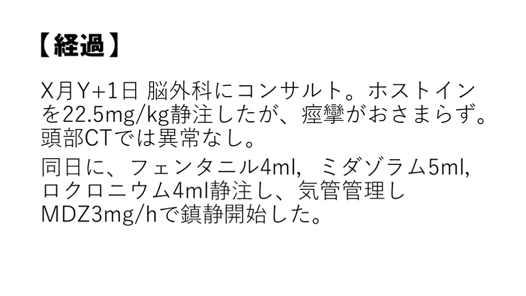 #5. 【経過】 X月Y+1日 脳外科にコンサルト。ホストインを22.5mg/kg静注したが、痙攣がおさまらず。頭部CTでは異常なし。