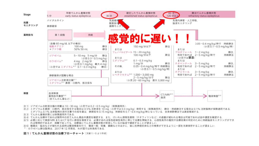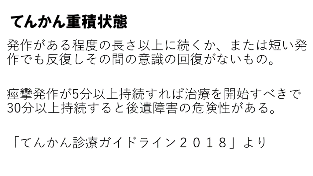 痙攣発作が5分以上持続すれば治療を開始すべきで30分以上持続すると後遺障害の危険性がある。