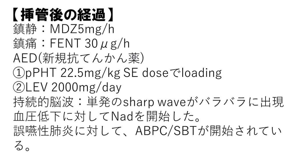 同日に、フェンタニル4ml,ミダゾラム5ml,ロクロニウム4ml静注し、気管管理しMDZ3mg/hで鎮静開始した。