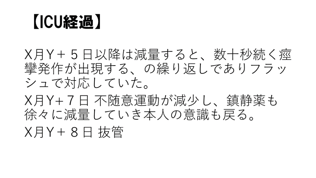 X月Y+7日 不随意運動が減少し、鎮静薬も徐々に減量していき本人の意識も戻る。
