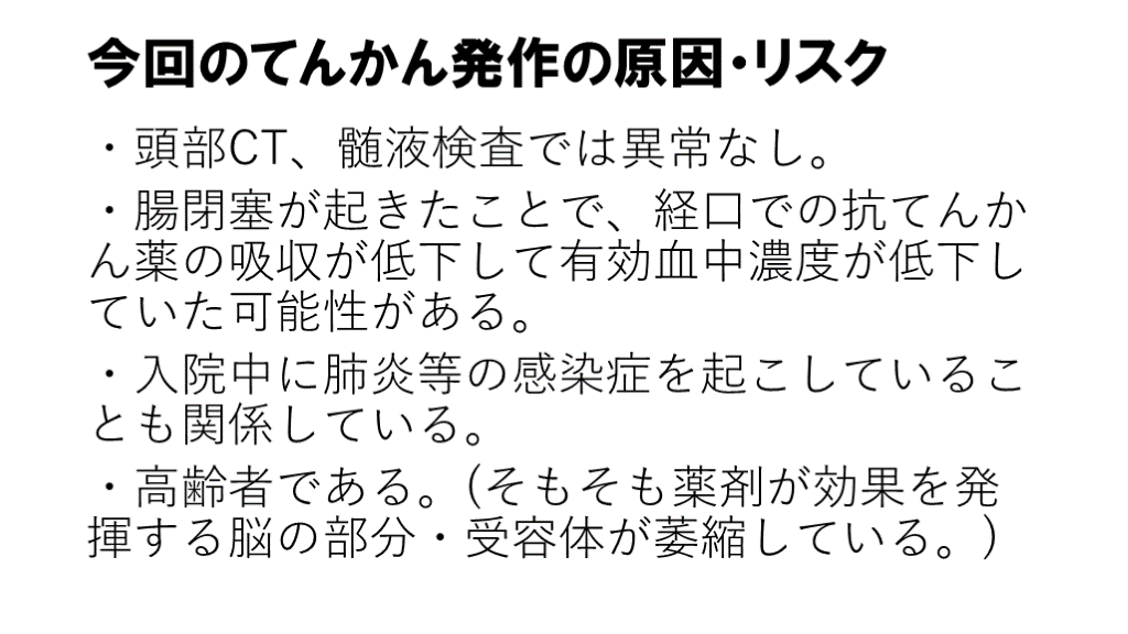 ・腸閉塞が起きたことで、経口での抗てんかん薬の吸収が低下して有効血中濃度が低下していた可能性がある。
