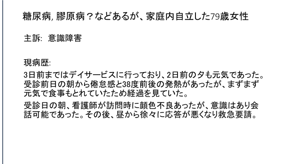 #3. 糖尿病, 膠原病?などあるが、家庭内自立した79歳女性 主訴: 意識障害