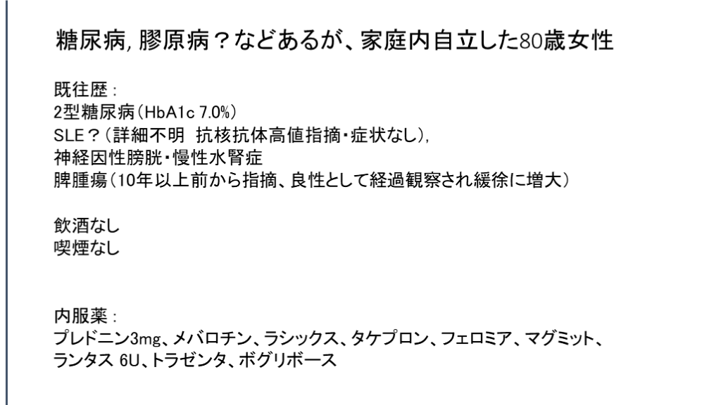 #4. 糖尿病, 膠原病?などあるが、家庭内自立した80歳女性 既往歴 :
