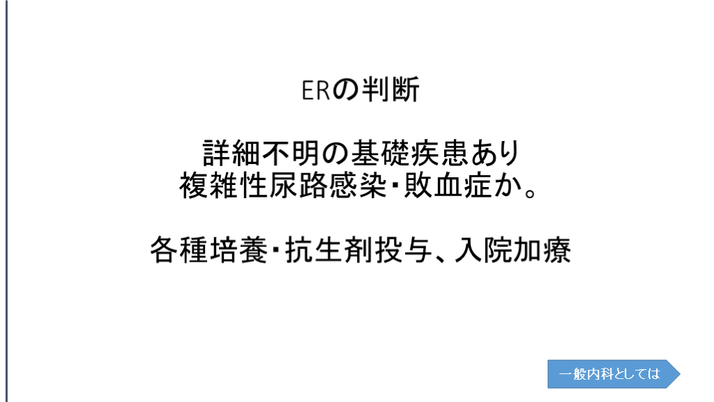#12. ERの判断詳細不明の基礎疾患あり複雑性尿路感染・敗血症か。各種培養・抗生剤投与、入院加療 一般内科としては
