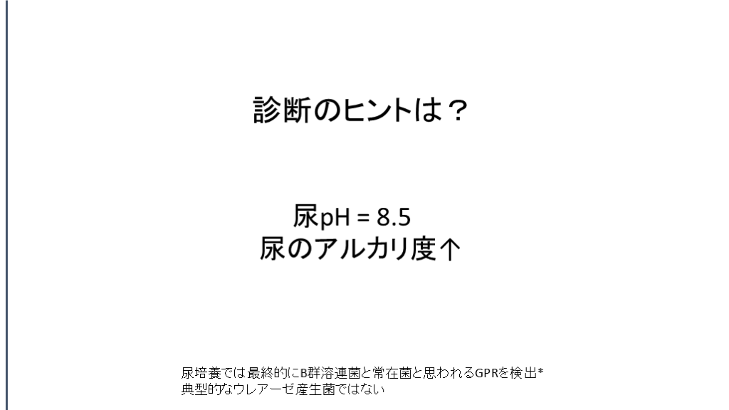 尿のアルカリ度↑ 尿培養では最終的にB群溶連菌と常在菌と思われるGPRを検出*