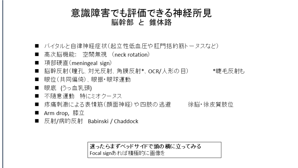 #33. 意識障害でも評価できる神経所見脳幹部 と 錐体路 バイタルと自律神経症状(起立性低血圧や肛門括約筋トーヌスなど)