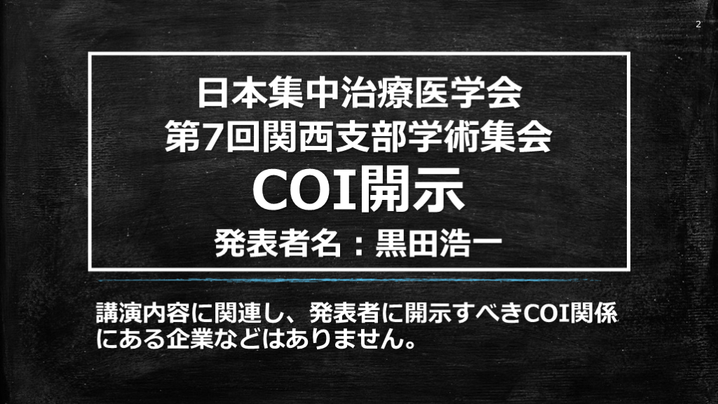 #2. 日本集中治療医学会 第7回関西支部学術集会COI開示 発表者名:黒田浩一 講演内容に関連し、発表者に開示すべきCOI関係にある企業などはありません。