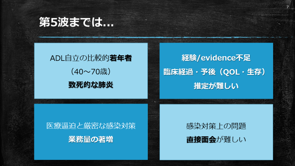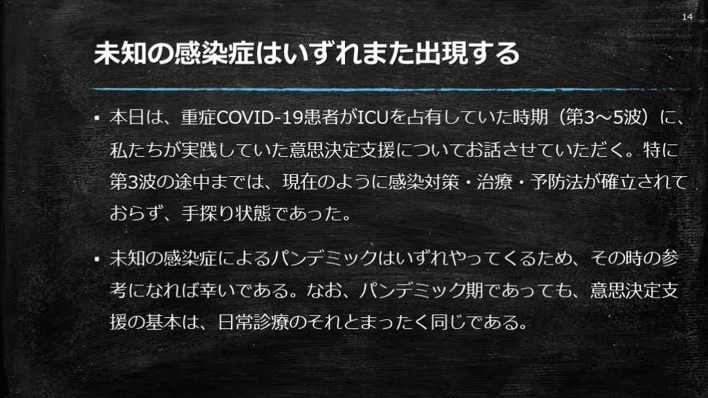 #14. 未知の感染症はいずれまた出現する 本日は、重症COVID-19患者がICUを占有していた時期(第3~5波)に、私たちが実践していた意思決定支援についてお話させていただく。特に第3波の途中までは、現在のように感染対策・治療・予防法が確立されておらず、手探り状態であった。