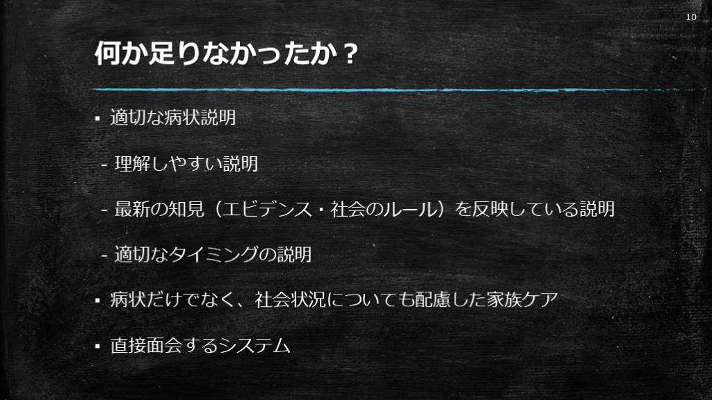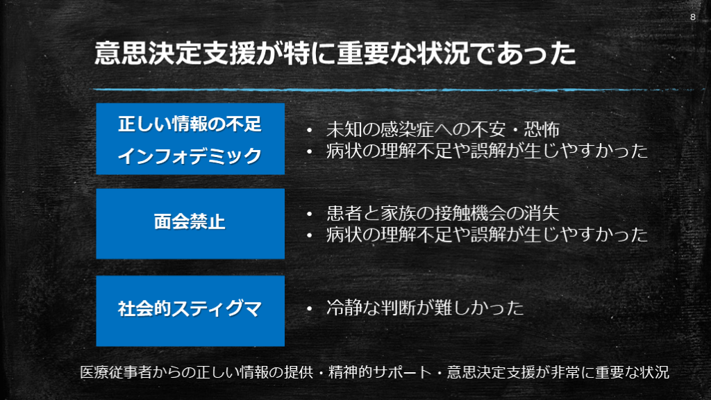 病状の理解不足や誤解が生じやすかった 医療従事者からの正しい情報の提供・精神的サポート・意思決定支援が非常に重要な状況 冷静な判断が難しかった 8