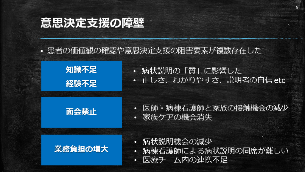 #9. 意思決定支援の障壁 患者の価値観の確認や意思決定支援の阻害要素が複数存在した 知識不足