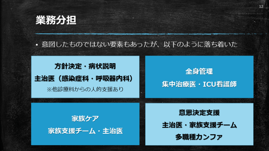 #12. 業務分担 意図したものではない要素もあったが、以下のように落ち着いた 方針決定・病状説明