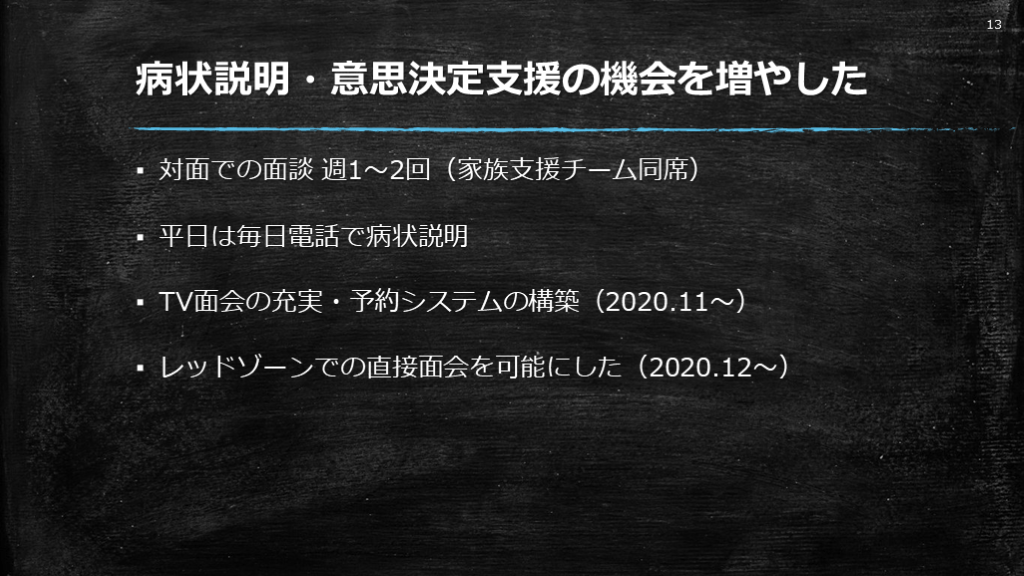 #13. 病状説明・意思決定支援の機会を増やした 対面での面談 週1~2回(家族支援チーム同席)